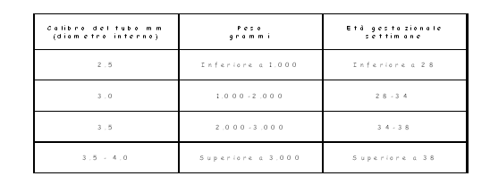 Dopo aver assicurato un’adeguata ventilazione, e solo dopo questa fase, ci si preoccuperà di avere una diagnosi eziologica del distress e di rimuovere, quando possibile, la causa. Tabelle. Calibro del tubo endotracheale in base al peso ed all’età gestazionale (AHA–AAP(5)) Profondità di inserzione del tubo endotracheale in base al peso (AHA–AAP(5))