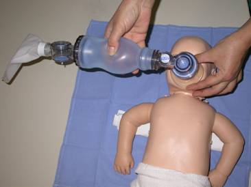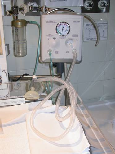 Per la ventilazione manuale si può impiegare: • Pallone tipo AMBU - Si possono raggiungere percentuali di O2 sino al 90% (con reservoir) - senza reservoir e con flusso di O2 di 5 l/min si eroga una miscela di gas con il 40 % di O2 - impiegando il pallone si possono raggiungere pressioni elevate (con rischio di PNX) soprattutto nel paziente intubato; ricordiamo la tecnica di 1 o più dita descritta nel manuale AHA-AAP(5) ma consigliamo di provare con l’ausilio di un manometro la propria sensibilità con lo strumento. - Nella ventilazione prolungata, occorre inoltre prestare attenzione alla frequenza degli atti respiratori imposti al nn. (FR) e del tempo in cui la pressione viene mantenuta, che corrisponde al tempoinspiratorio (Ti) Neo Puff - Con questo strumento sono impostabili le % O2 dal 21 al 100% (avendo a disposizione aria e O2) - le pressioni erogate sono controllate - occorre prestare attenzione a FR e Ti La ventilazione meccanica del neonato è generalmente praticata con ventilatori a limite di pressione e ciclo di tempo. Parametri standard: